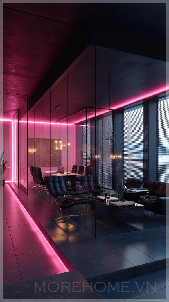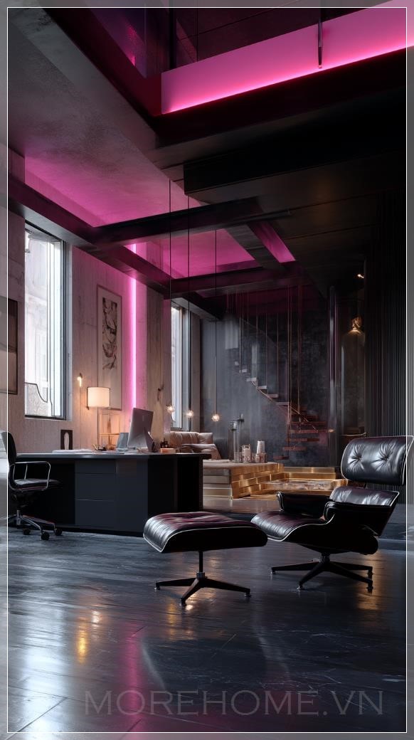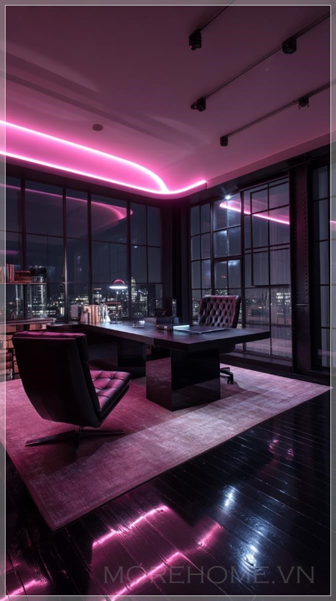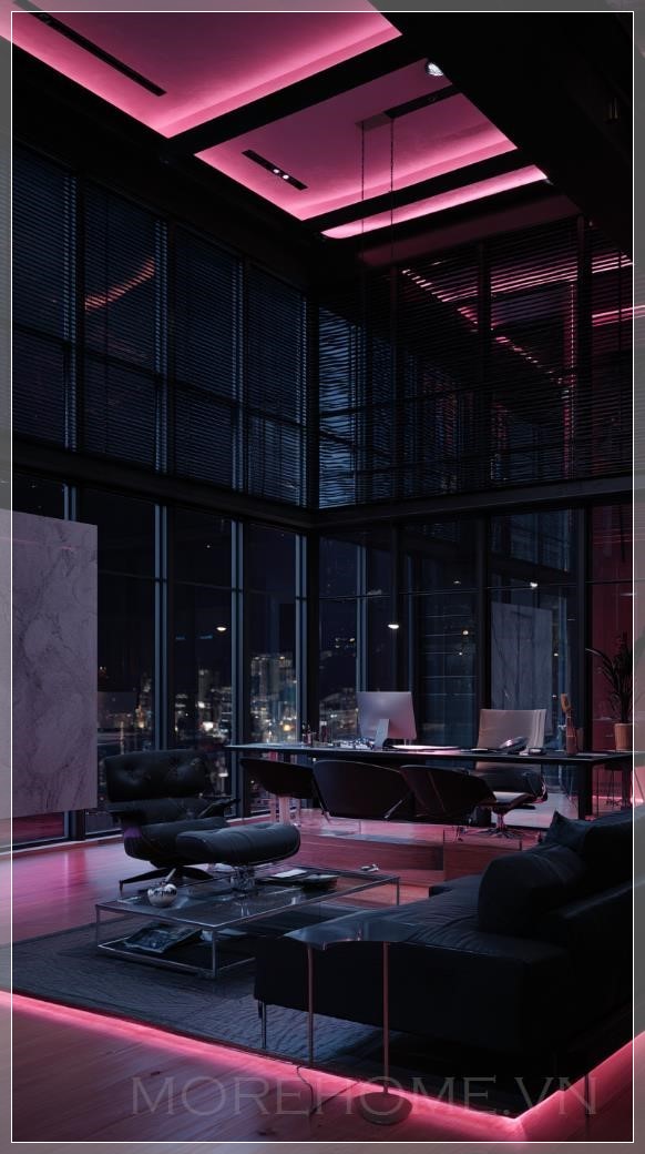 Văn phòng penthouse rộng lớn, sang trọng với tông màu đen toàn bộ, được chiếu sáng bởi đèn LED hồng vào ban đêm. Các bức tường và sàn đều được hoàn thiện bằng vật liệu tối màu, tạo nên một không gian đầy sang trọng và bí ẩn. Những chiếc đèn LED hồng nổi bật, tô điểm không gian và tạo ra hiệu ứng ánh sáng lãng mạn, mạnh mẽ. Một chiếc bàn làm việc lớn, thiết kế hiện đại với các chi tiết tối giản, đặt ở giữa căn phòng, tạo sự cân đối và phong cách. Ghế ngồi da đen bóng loáng, kết hợp hoàn hảo với không gian chung, trong khi các yếu tố trang trí tinh tế, như tác phẩm nghệ thuật trên tường và cây xanh, làm dịu đi vẻ lạnh lẽo của không gian. Ánh sáng hồng phát ra từ các đèn LED dọc theo trần và xung quanh phòng tạo ra một không khí đầy mê hoặc và hiện đại.