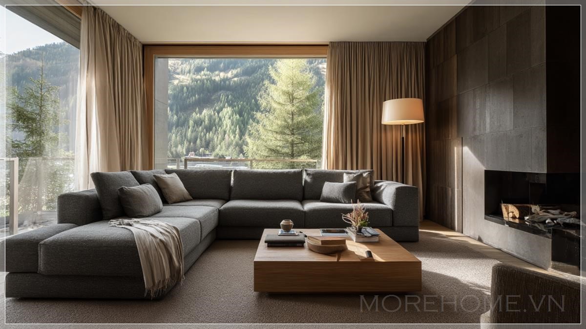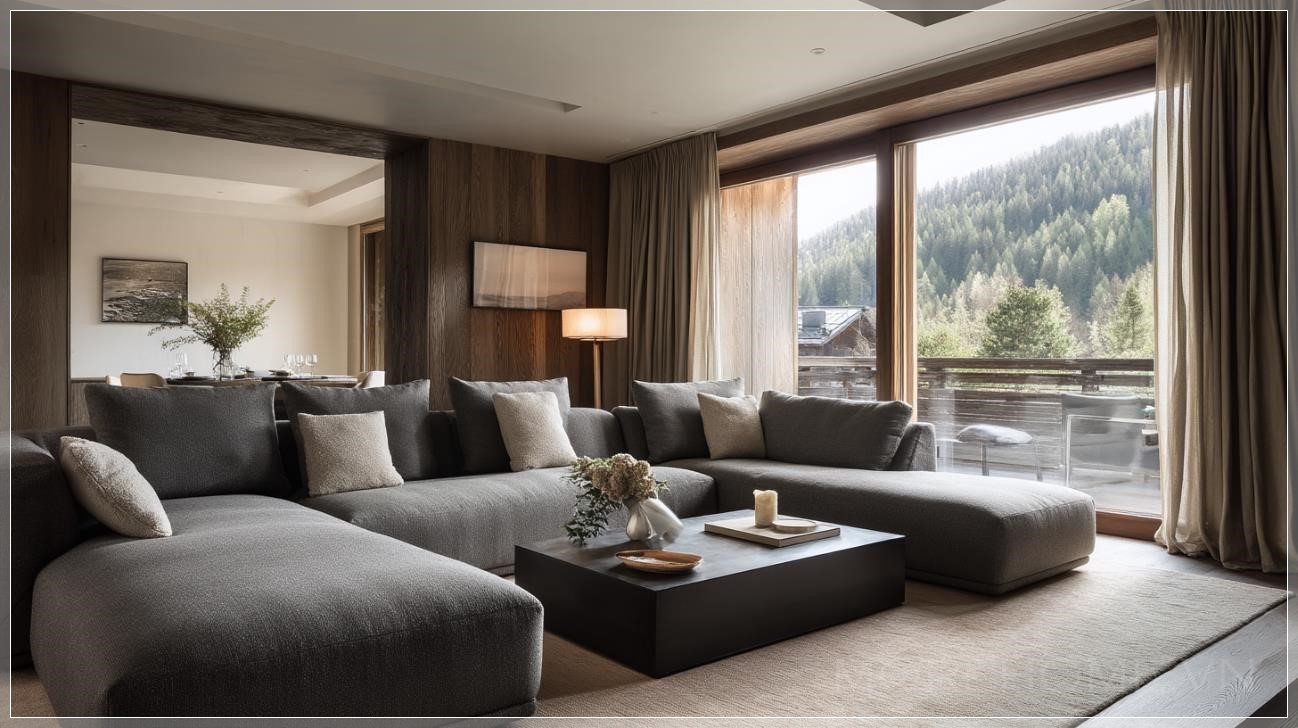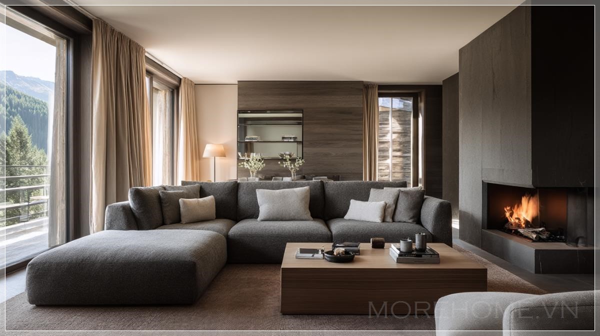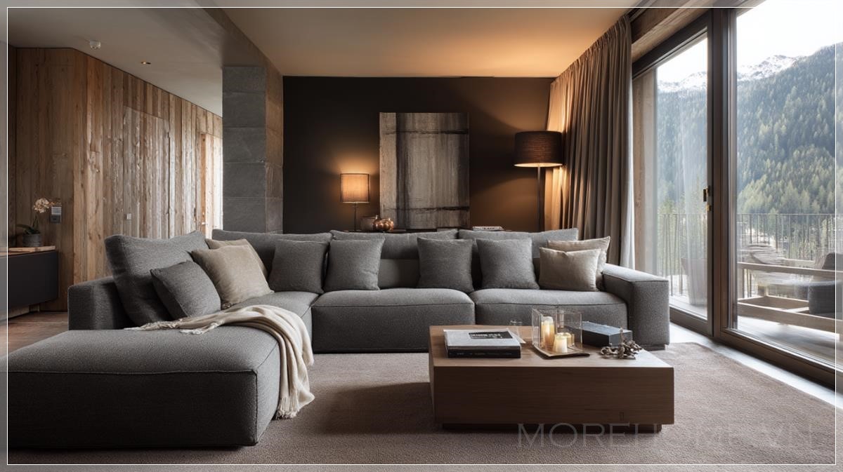 Phòng khách của một khách sạn sang trọng nằm tại dãy núi Alps, được chụp theo phong cách nhiếp ảnh của Architectural Digest. Trong bức ảnh phòng khách tối màu với phong cách tối giản hiện đại, một chiếc sofa hình chữ U màu xám nhạt năm chỗ ngồi được đặt ở vị trí trung tâm của phòng khách, chiếm vị trí chính trong bức ảnh. Thảm màu nâu mềm mại, ánh sáng tự nhiên rực rỡ, mang đến vẻ đẹp thẩm mỹ của tạp chí kiến trúc nội thất. Độ phân giải 4K với các điểm ảnh sắc nét. Được chụp bằng ống kính tele.